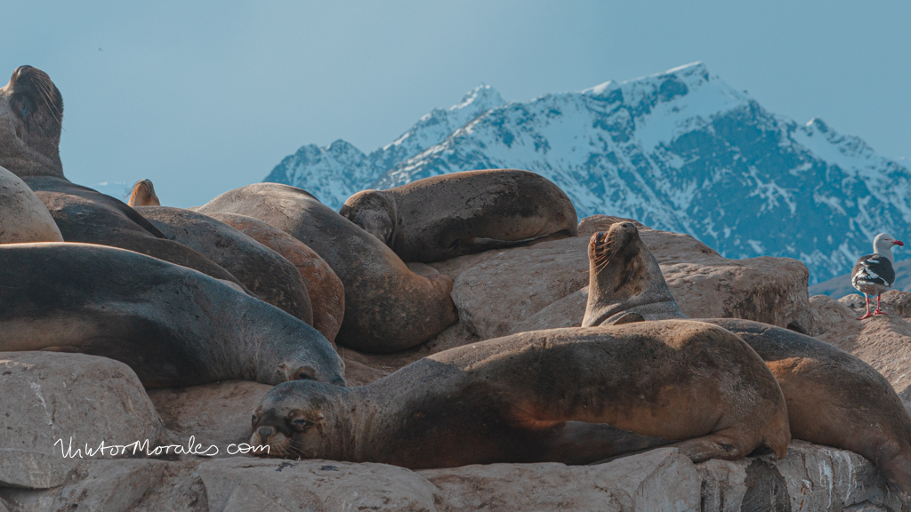 Lobos marinos de un pelo descansando en los islotes Les Eclaireurs en el Canal Beagle, Ushuaia, Tierra del Fuego, Patagonia Argentina.